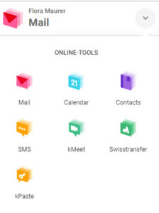 Links neben deinem Namen auf den Pfeil klicken. So kannst du wechseln zu den weiteren Tools des WebMail. Mail: Kalender: Kontakt: SwissTransfer: |